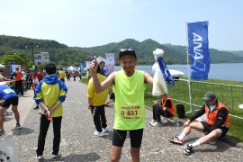 おおむねフラットですが、細かなアップダウンがあります。今年は晴れていたので湖を望む景色や木陰の気持ちよさに癒されながら走ることができました。給水のボランティアの高校生からは元気を頂き、気持ちよく完走できました。